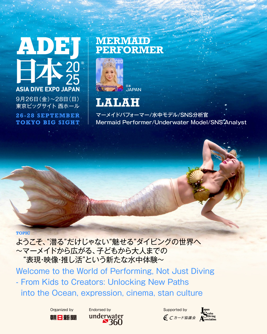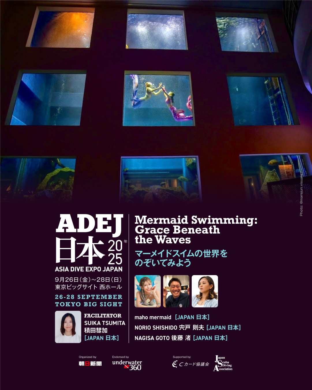 マーメイドパフォーマー・水中モデルとして国内外で活動。水族館でのマーメイドショーショー企画・出演を通じて、海の魅力や神秘性を伝えるほか、水中モデルとして企業広告やアート作品にも多数出演。“魅せる水中”の可能性を広げている。